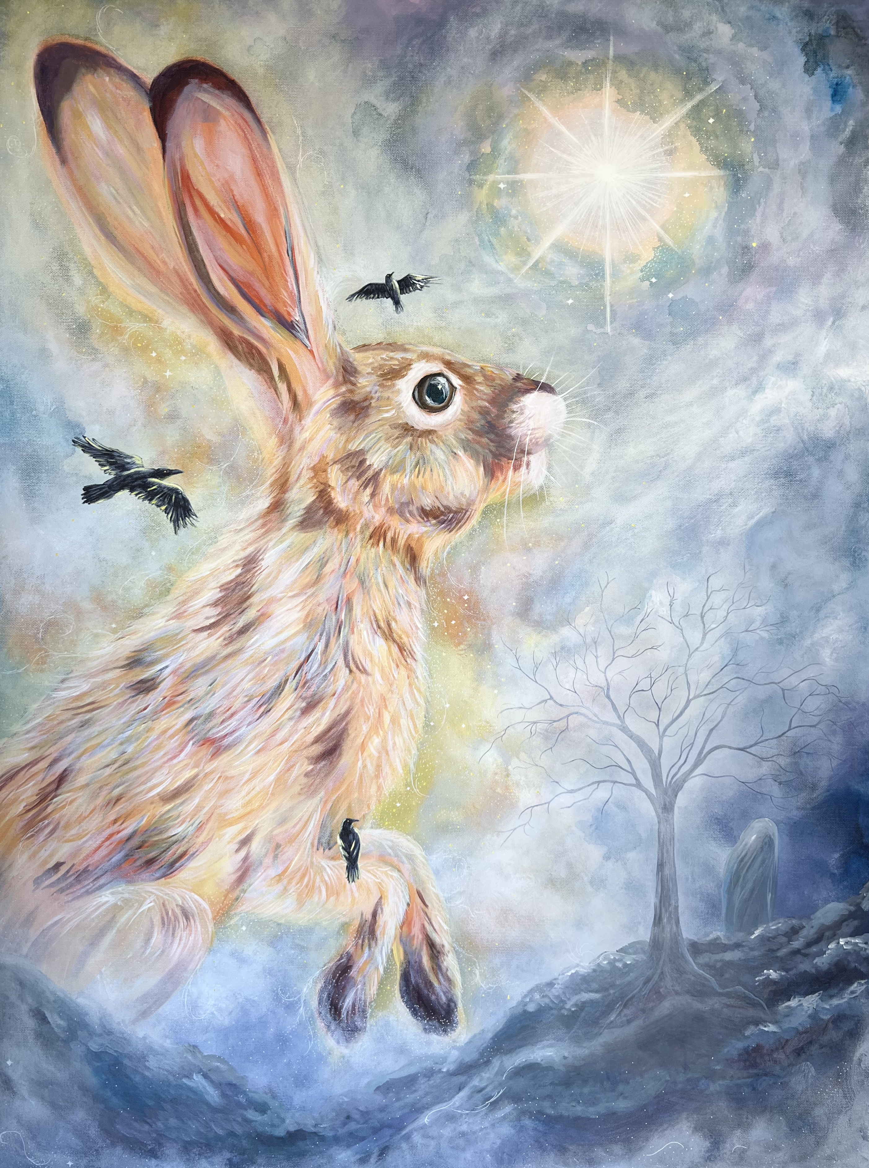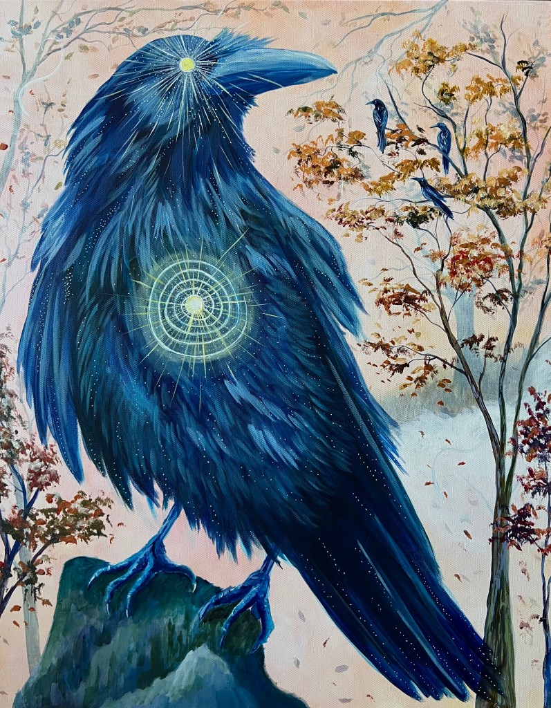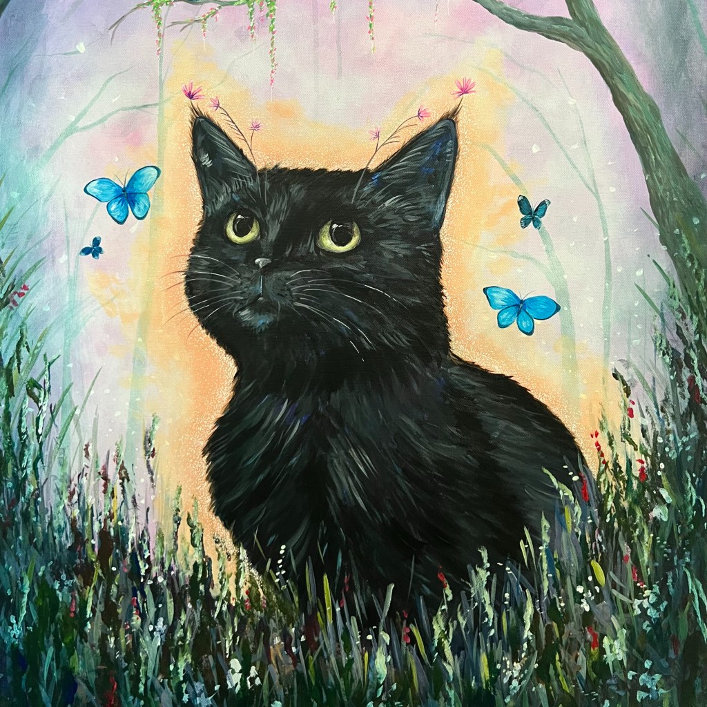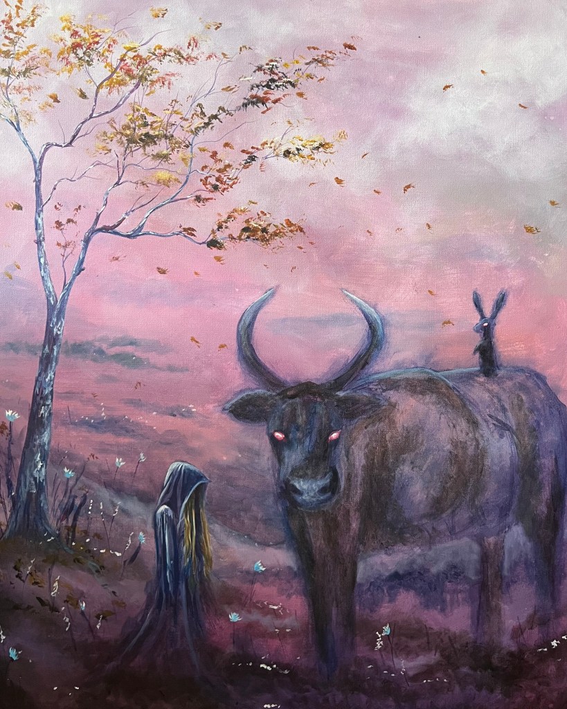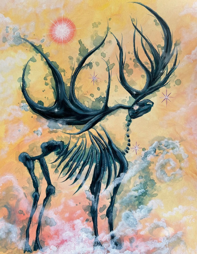 I paint nature scenes with esoteric influences, drawing inspiration from both the physical and the otherworldly. I channel the spirit realm and my love for the animals around me through my work, and I seek to capture it all– their brightness and darkness shimmering with magic.