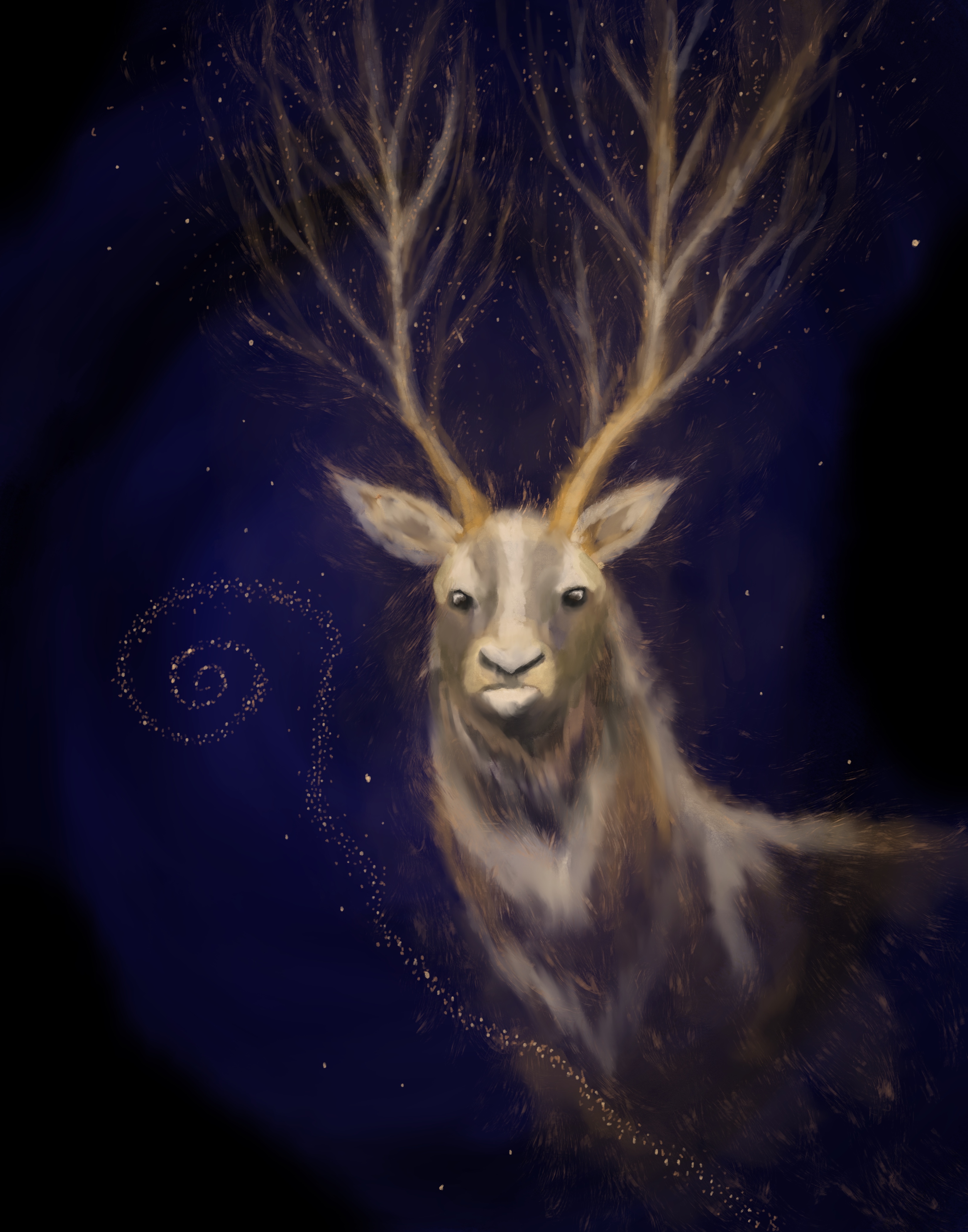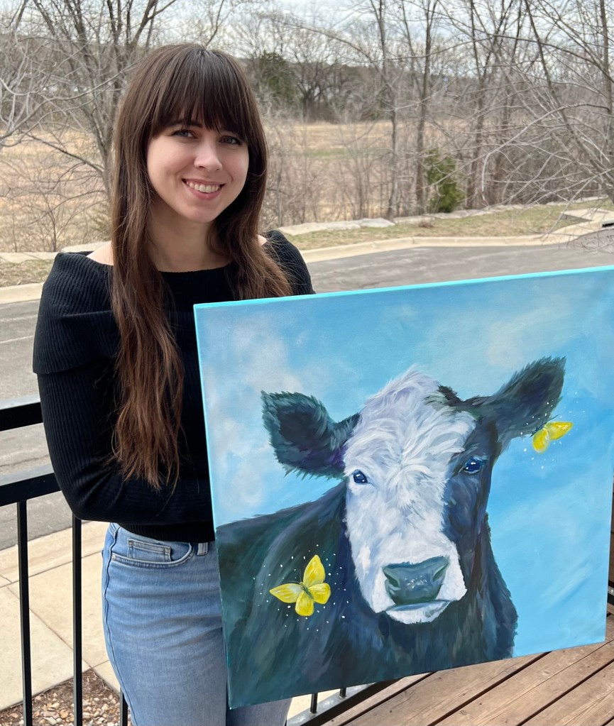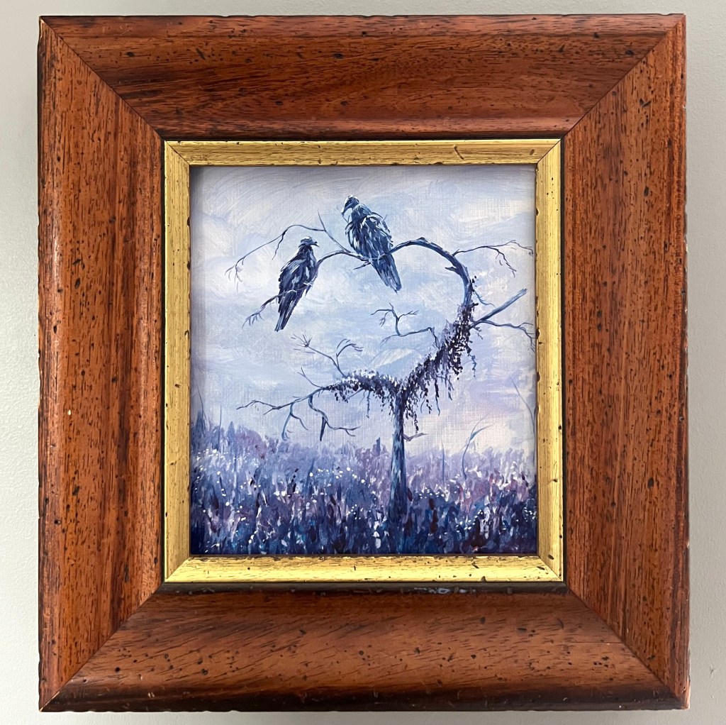 I paint nature scenes with esoteric influences, drawing inspiration from both the physical and the otherworldly. I channel the spirit realm and my love for the animals around me through my work, and I seek to capture it all– their brightness and darkness shimmering with magic.
