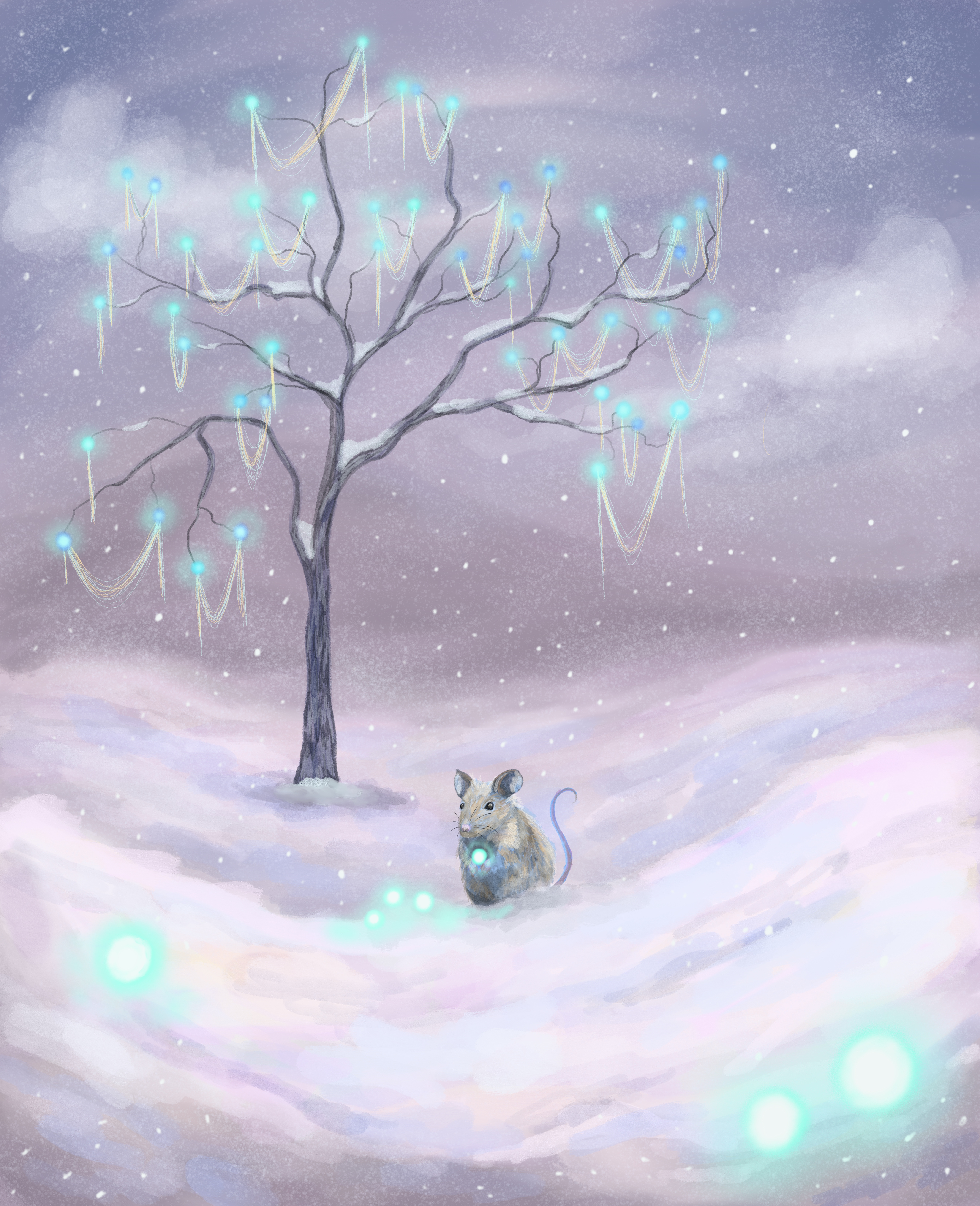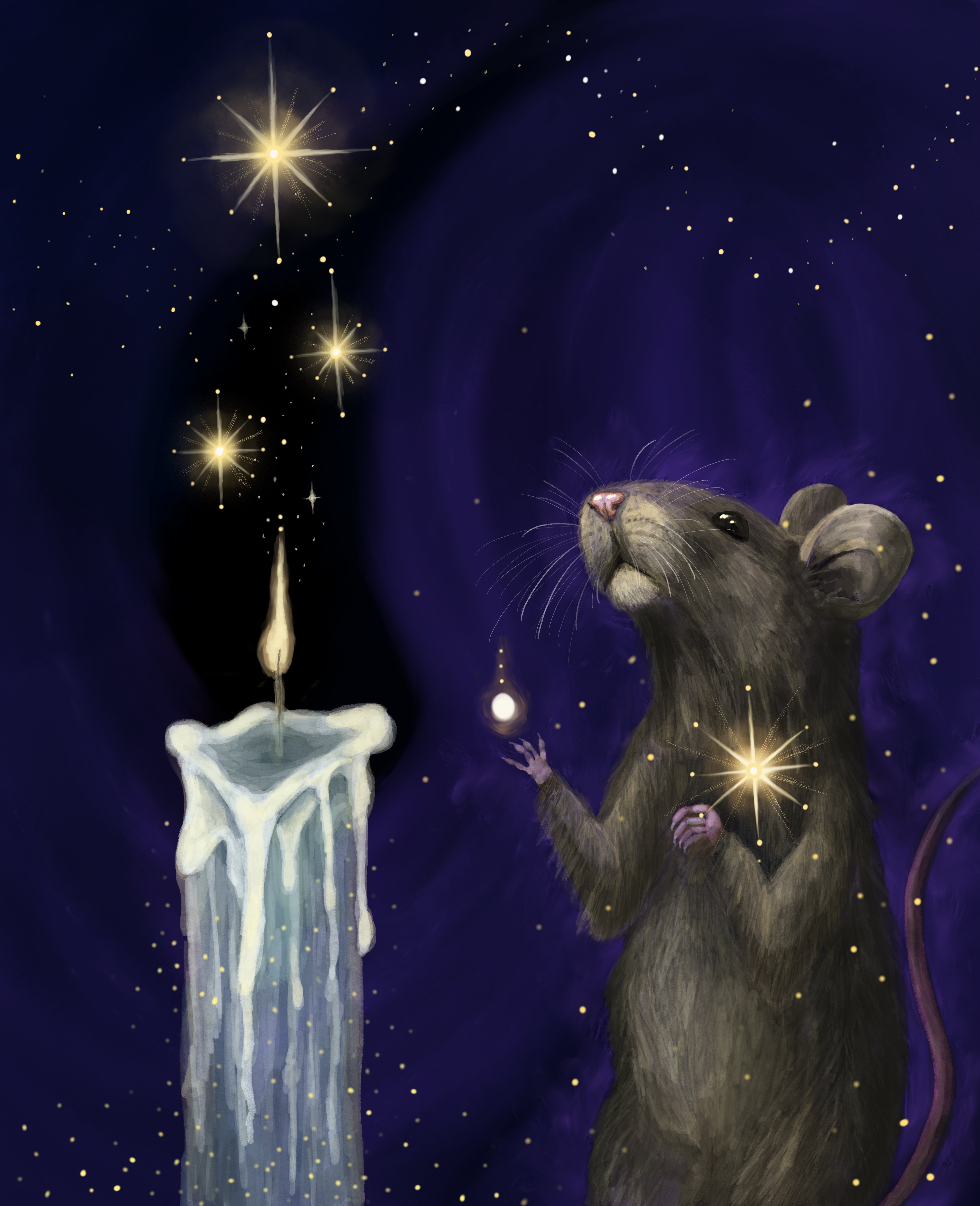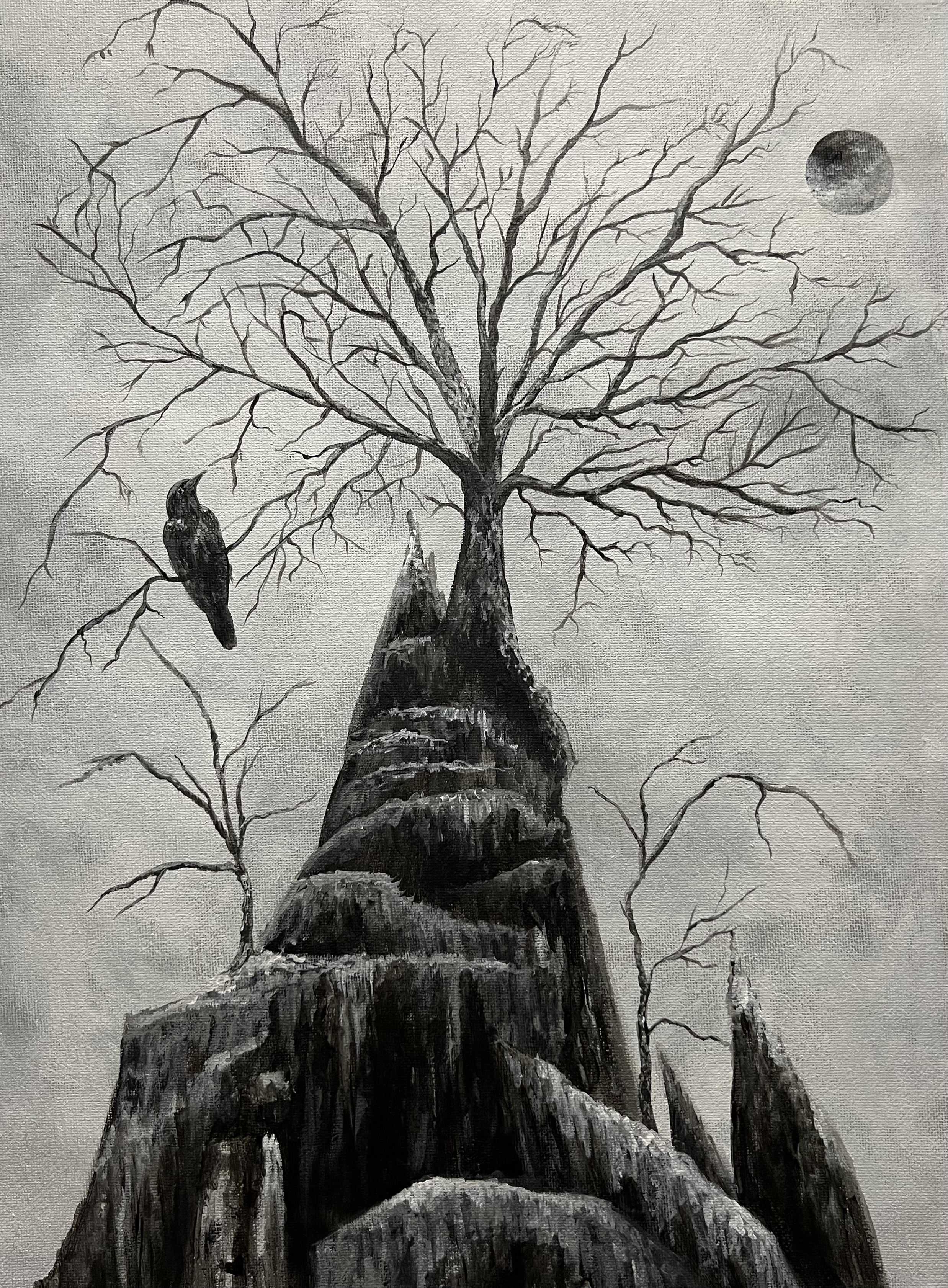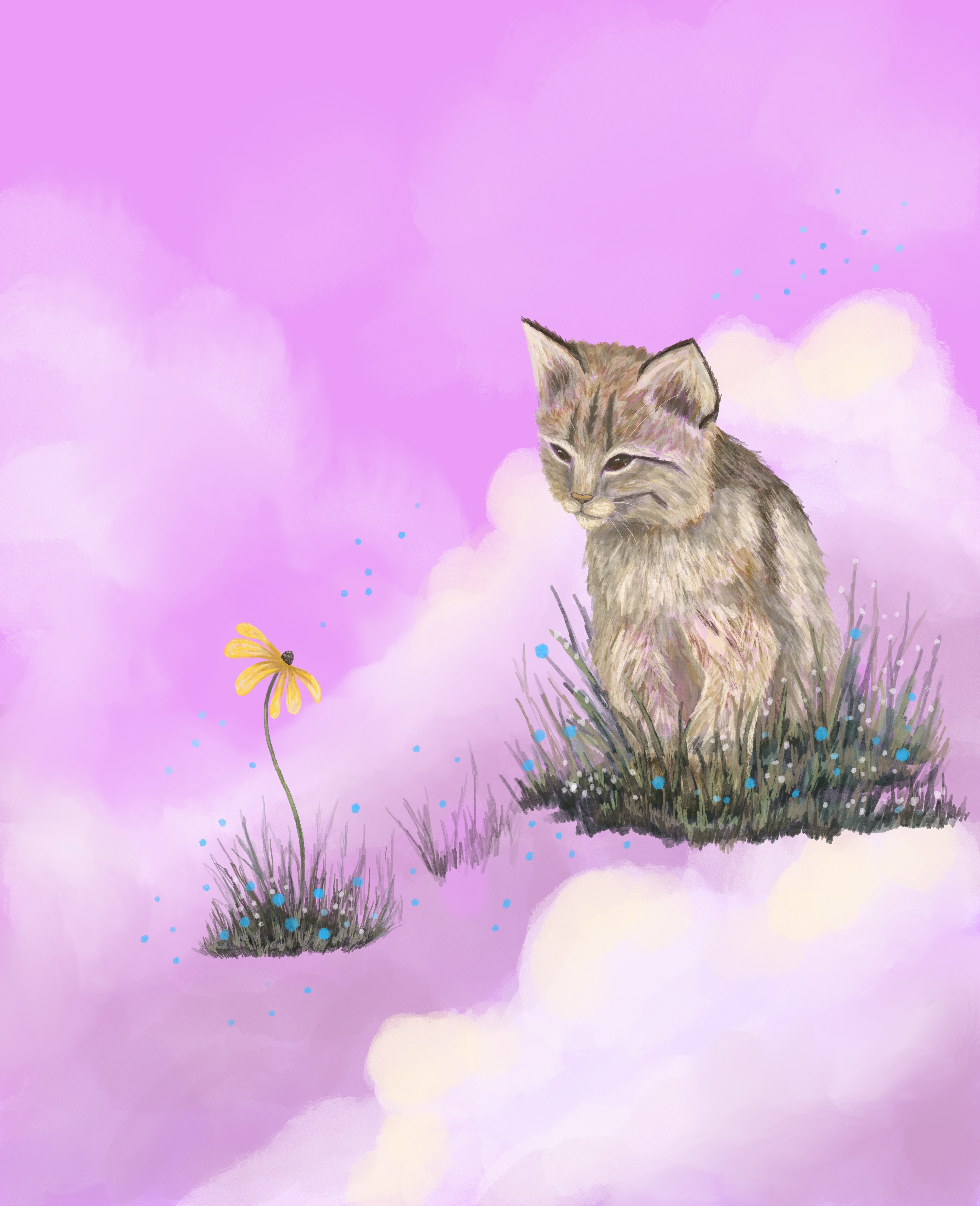 I paint nature scenes with esoteric influences, drawing inspiration from both the physical and the otherworldly. I channel the spirit realm and my love for the animals around me through my work, and I seek to capture it all– their brightness and darkness shimmering with magic.
